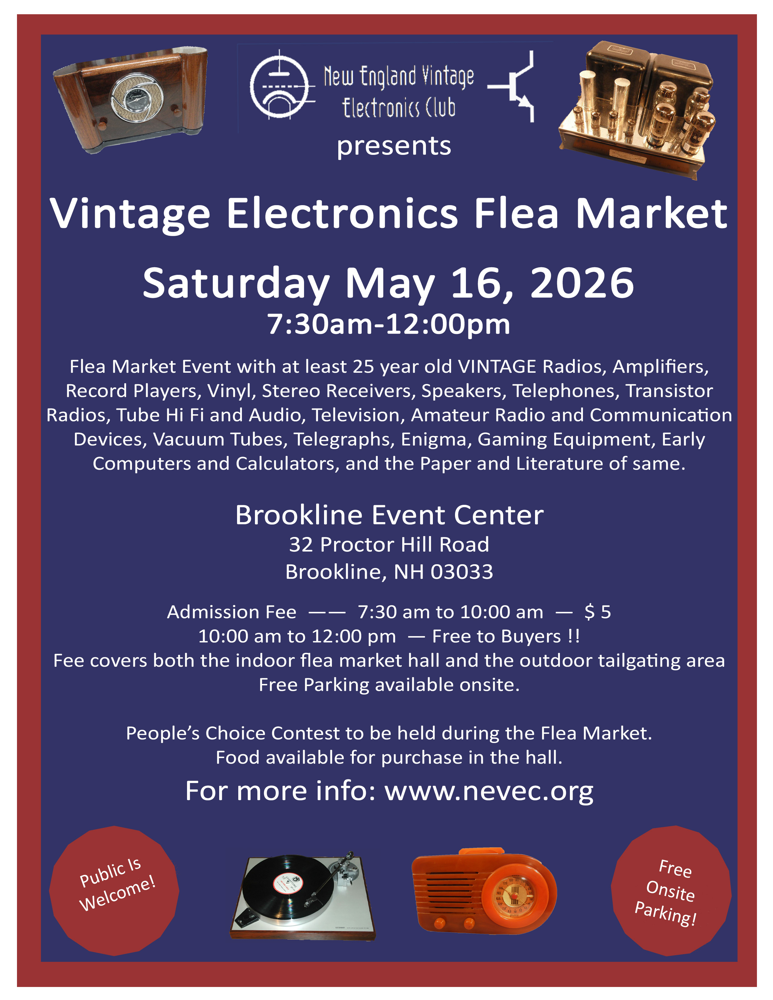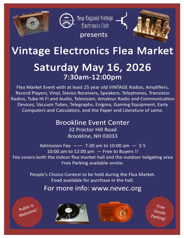 Much of the New England Vintage Electronics Club (NEVEC) activity focuses around the club “swap meets” or vintage electronics “flea markets.” These events, open to the public, provide the opportunity to buy, sell and trade vintage items such as radios, phonographs, tube type audio amplifiers, Hi-Fi stereo components, TVs, computers, parts, vinyl, books, magazines, and more. Plan to attend and enjoy a day of fun, camaraderie, and vintage electronics nostalgia.